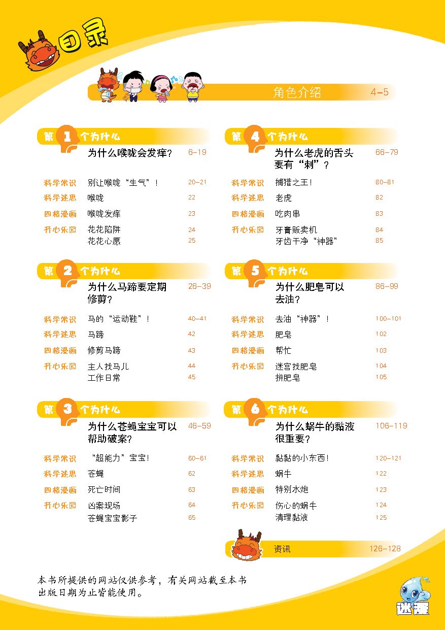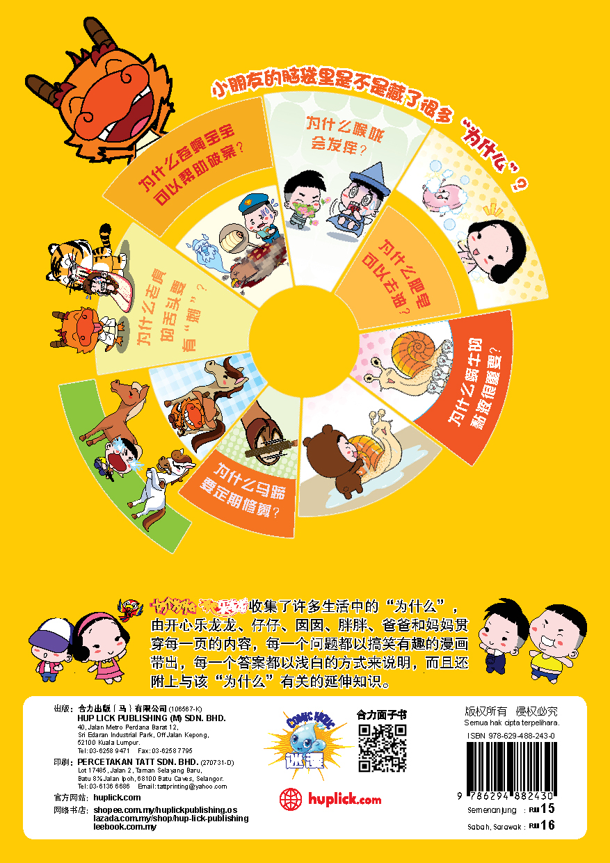 小朋友的脑袋里是不是藏了很多“为什么”? 📚 马来西亚首个配合 Astro 小太阳频道动画而出版的儿童图书 🎉 💯 系列总销售量突破1,800,000本,长年称霸Popular畅销中文童书排行榜🔥 😍 由小朋友亲自发问,真正满足小朋友的求知欲和好奇心 🤩 💞 以搞笑有趣的图文内容带出生活中每一个“为什么” ❓ 《十万个为什么开心乐龙龙》收集了许多生活中的“ 为什么” , 由开心乐龙龙、仔仔、囡囡、胖胖、爸爸和妈妈贯穿每一页的内容, 每一个问题都以搞笑有趣的漫画带出,每一个答案都以浅白的方式来说明, 而且还附上与该“ 为什么” 有关的延伸知识。 如果你想知道每一个“为什么”的答案,成为一个万千问题都难不倒的小博士, 快翻开《十万个为什么开心乐龙龙》,用心阅读每一页, 开心度过每一天! 👇 本 期 故 事 亮 点 👇 【十万个为什么 开心乐龙龙 第135期:为什么喉咙会发痒?】 为什么喉咙会发痒? / 为什么马蹄要定期修剪? / 为什么苍蝇宝宝可以帮助破案? / 为什么老虎的舌头要有”刺“? / 为什么肥皂可以去油? / 为什么蜗牛的舔液很重要?