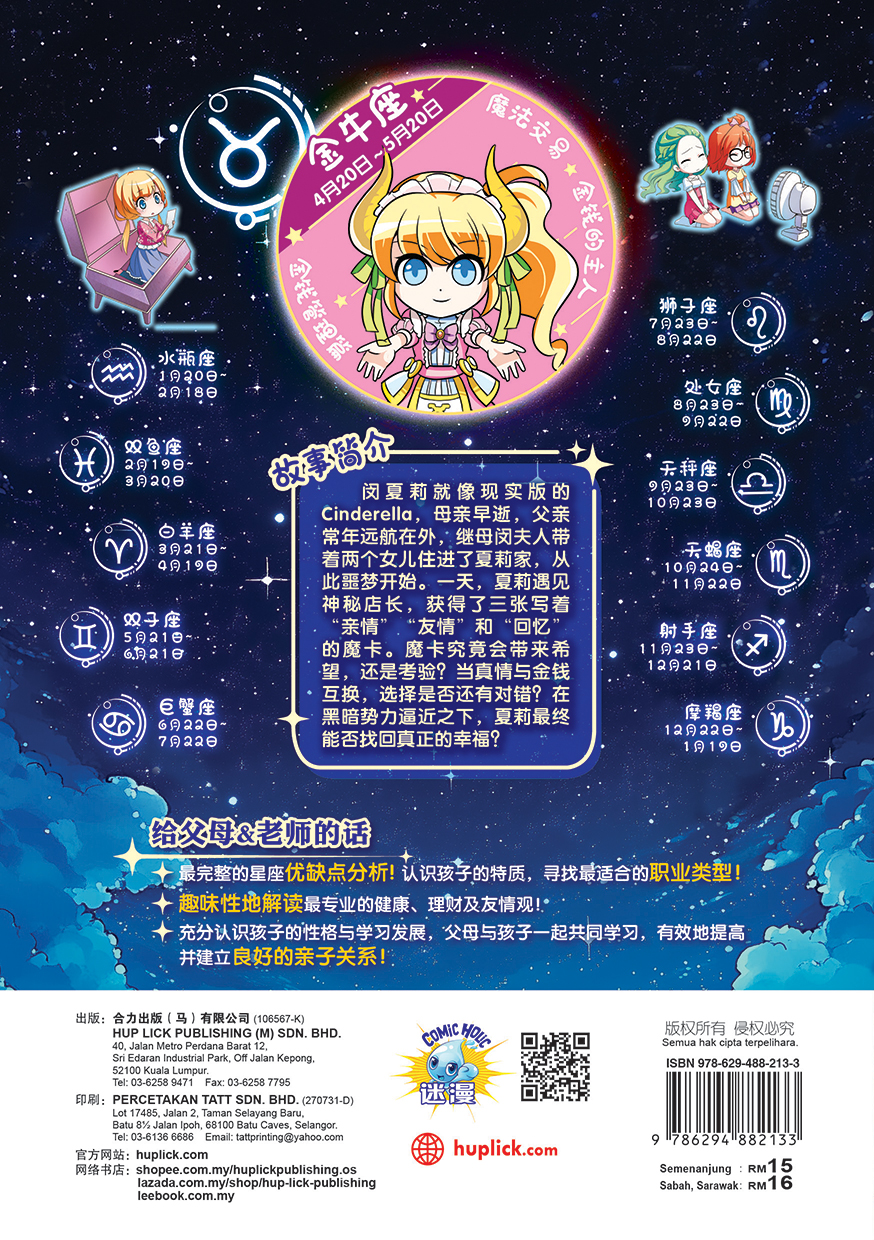 🌟 星座美少女系列(粉幻修订版) 🌟 ✨ 星座物语 × 品德教育 ✨ 【孩子爱看,父母放心】 这套书结合趣味十二星座故事,深入浅出解读性格、友情、健康、理财观,帮助孩子轻松认识自己与他人。 ✨第四期:魔法交易:金钱的主人(金牛座/金钱管理篇)✨ 闵夏莉就像现实版的 Cinderella,母亲早逝,父亲常年远航在外, 继母闵夫人带着两个女儿住进了夏莉家, 从此噩梦开始。一天, 夏莉遇见神秘店长, 获得了三张写着 “亲情” “友情” 和“回忆” 的魔卡。魔卡究竟会带来希望, 还是考验? 当真情与金钱互换, 选择是否还有对错? 在黑暗势力逼近之下, 夏莉最终能否找回真正的幸福? 【给父母&老师的话】 – 最完整的星座优缺点分析! 认识孩子的特质,寻找最适合的职业类型! – 趣味性地解读最专业的健康、理财及友情观! – 充分认识孩子们的性格与学习发展,父母亲与孩子们一起共同学习,有效地提高并建立良好的亲子关系!
