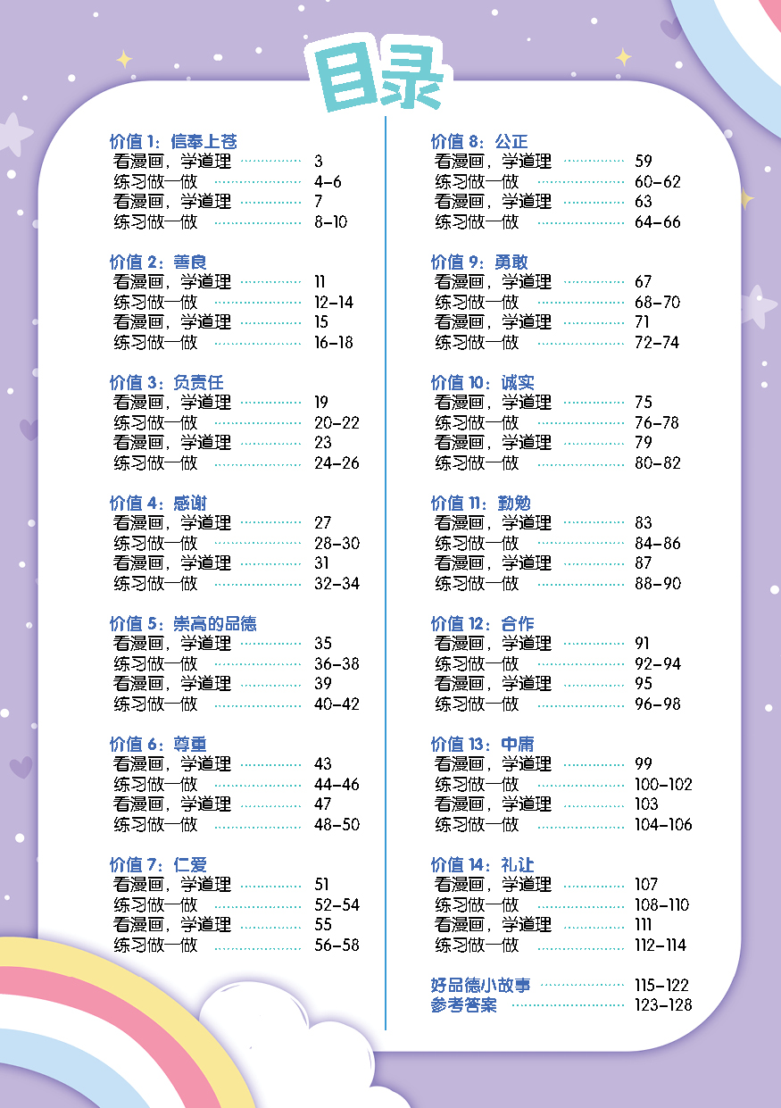 《乐学道德》备有与14个道德价值相关的漫画与 练习,漫画内容轻松、温馨、富有教育意义; 练习则有助于孩子巩固在课堂上所学到的道德 知识。此书最后附上好品德小故事,通过有趣的小故事教导孩子正确的道德观念。 🌈 《乐学道德》特点 1. 图文并茂,激发阅读兴趣 提供14个道德价值相关的漫画,以温馨有趣的漫画引入主题,让孩子在轻松愉快的阅读中理解道德情境。 2. 漫画故事生活化,贴近儿童生活 每个漫画故事都取材自孩子熟悉的生活场景,让道德教育不再抽象。 3. 引导思考,培养品格 每个道德价值都有提供小练习,引导孩子思考,让他们学会从生活中做出正确的选择。 4. 老师的好帮手 老师可将漫画与练习结合课堂教学,提升学生学习兴趣,也方便课堂讨论。 5. 亲子共读,共同成长 这本书也方便家长陪伴孩子阅读与讨论,共同培养孩子的品德与情感。 6. 激发共情 这本书附上品德小故事,温馨的故事情节让孩子设身处地体会他人的感受,学会为人处事的道理。 🎯 适合对象 – 老师课堂教学辅助 – 家长亲子共读
