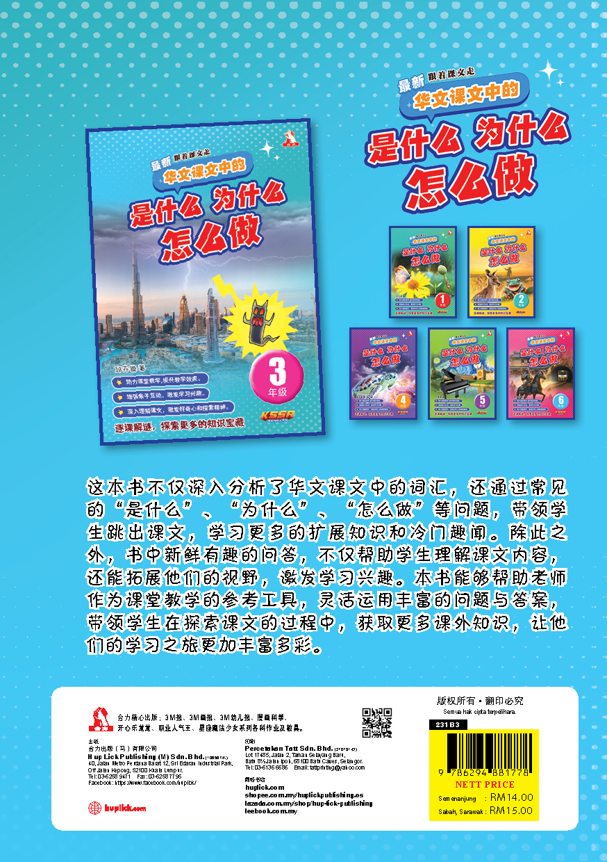☆ 助力课堂教学,提升教学效果。 – 这本书不仅深入分析了华文课文中的词汇,还通过常见 的 “是什么”、 “为什么”、“怎么做” 等问题,带领学生跳出课文,学习更多的扩展知识和冷门趣闻。除此之外,书中新鲜有趣的问答,不仅帮助学生理解课文内容, 还能拓展他们的视野,激发学习兴趣。本书能够帮助老师作为课堂教学的参考工具,灵活运用丰富的问题与答案, 带领学生在探索课文的过程中,获取更多课外知识,让他们的学习之旅更加丰富多彩。