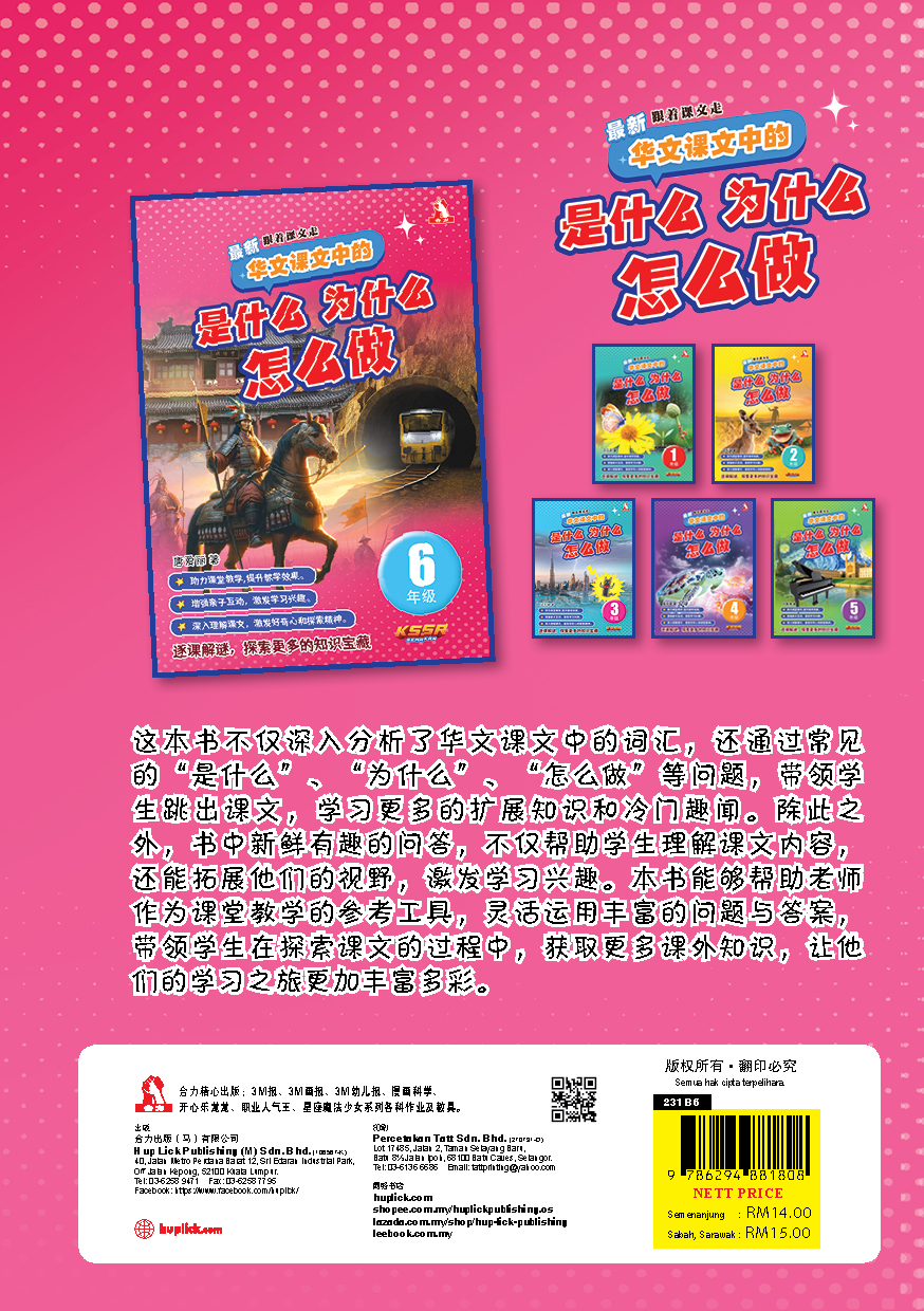 ☆ 助力课堂教学,提升教学效果。 – 这本书不仅深入分析了华文课文中的词汇,还通过常见 的 “是什么”、 “为什么”、“怎么做” 等问题,带领学生跳出课文,学习更多的扩展知识和冷门趣闻。除此之外,书中新鲜有趣的问答,不仅帮助学生理解课文内容, 还能拓展他们的视野,激发学习兴趣。本书能够帮助老师作为课堂教学的参考工具,灵活运用丰富的问题与答案, 带领学生在探索课文的过程中,获取更多课外知识,让他们的学习之旅更加丰富多彩。